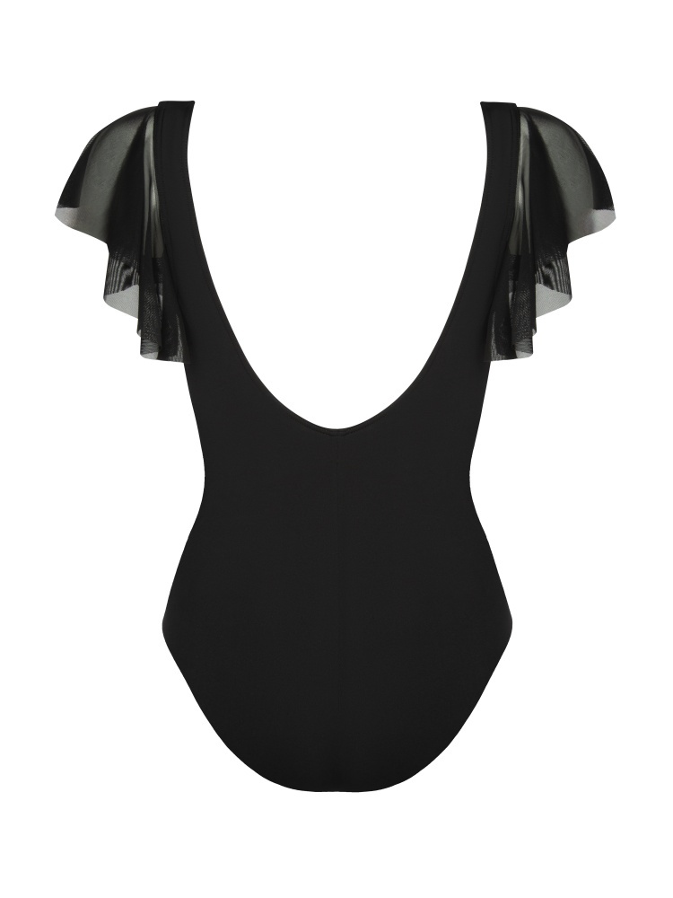 Изящный слитный купальник со вставкой в области груди из эластичной сеточки, а так же декоративными рукавами из сеточки. Формованная чашка, без push up. Полузакрытая спинка. Фурнитура желтого цвета. Качественный материал, устойчивый к хлорированной и соленой воде, солнечным лучам и ультрафиолету.