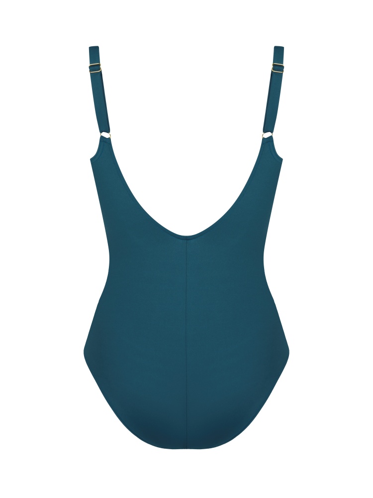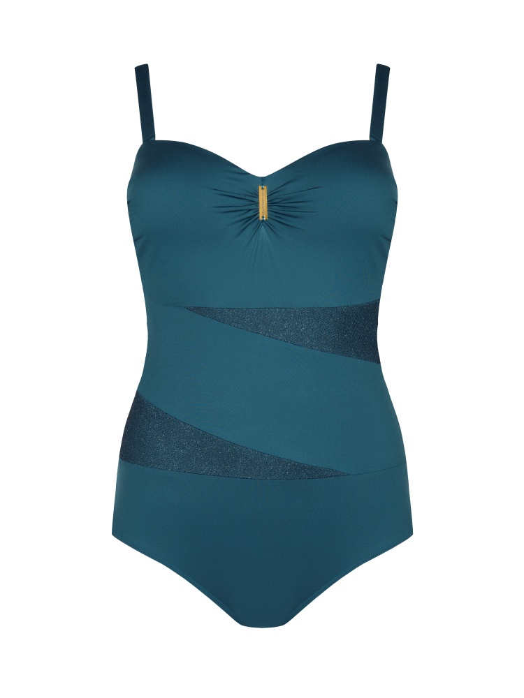 Элегантный слитный купальник, декорированный сеточкой, соблазнительно подчеркивающей силуэт. Мягкая формованная чашка, застежка сзади, регулируемые бретели, фурнитура желтого цвета.
